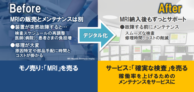 MRIにセンサを取り付け保守システムに稼働情報を収集、これまで培ってきたデータと統合し故障の予知を行っております。