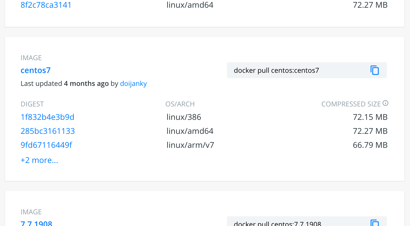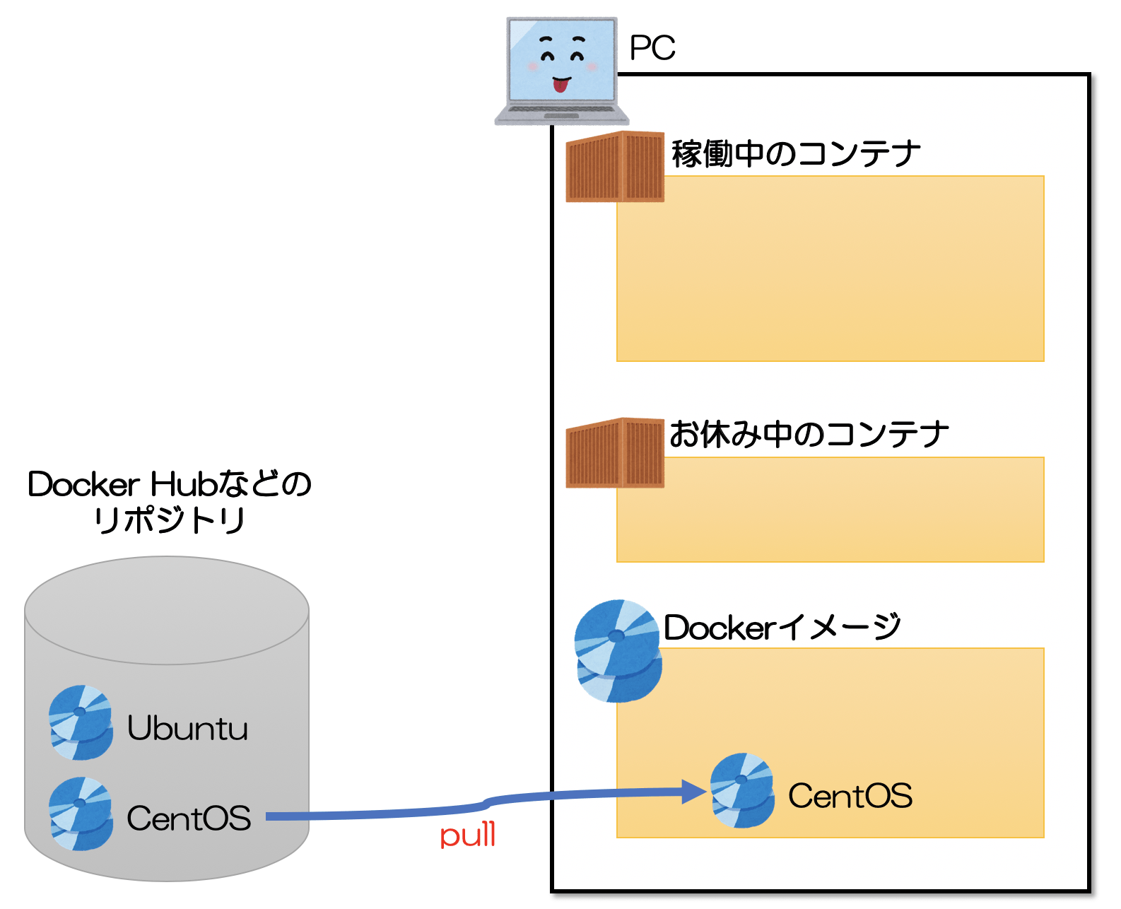 以下のコマンドは、Docker HubからCentOSというイメージで、タグがCentOS7(CentOSのバージョンが7)のDockerイメージをダウンロードするものです。