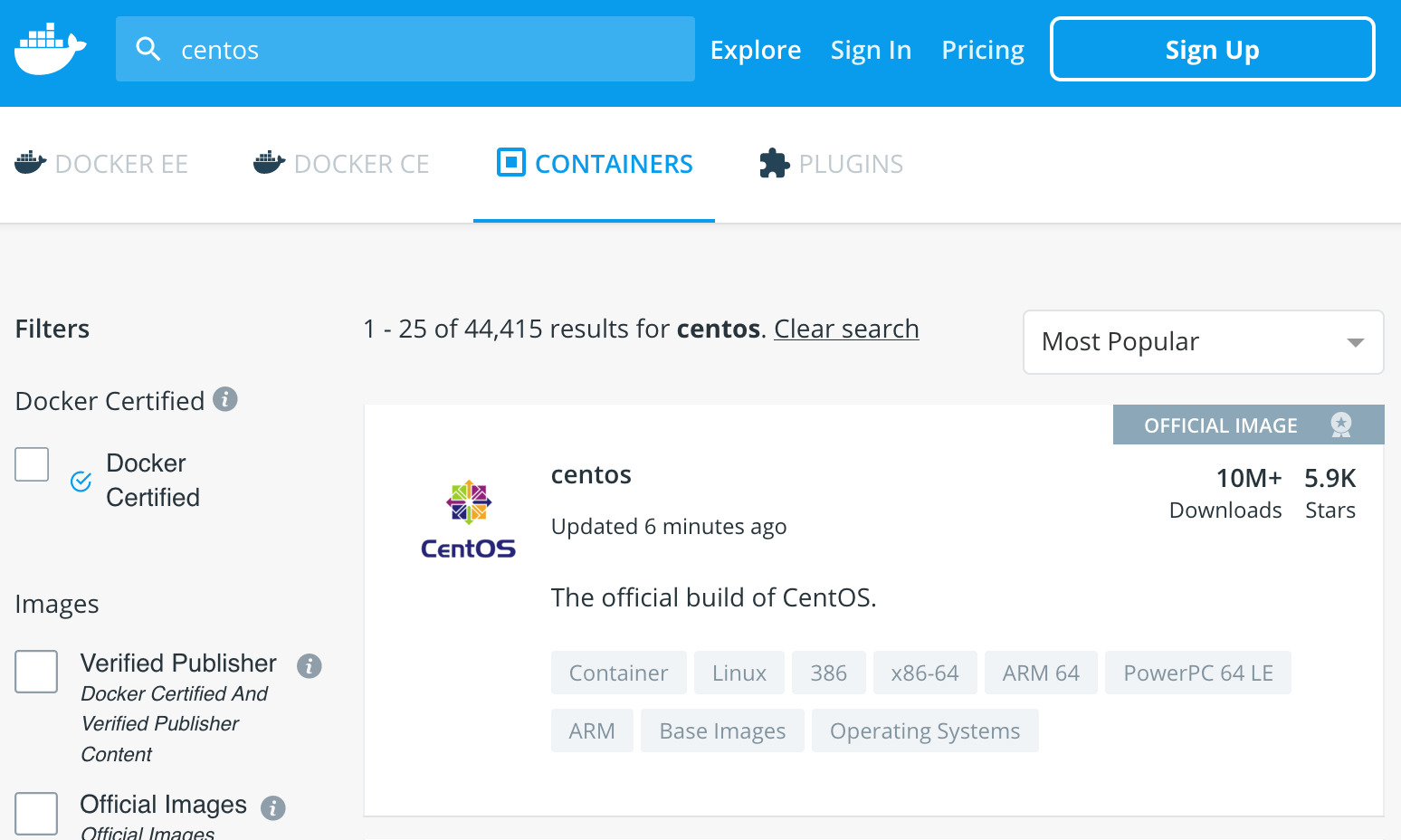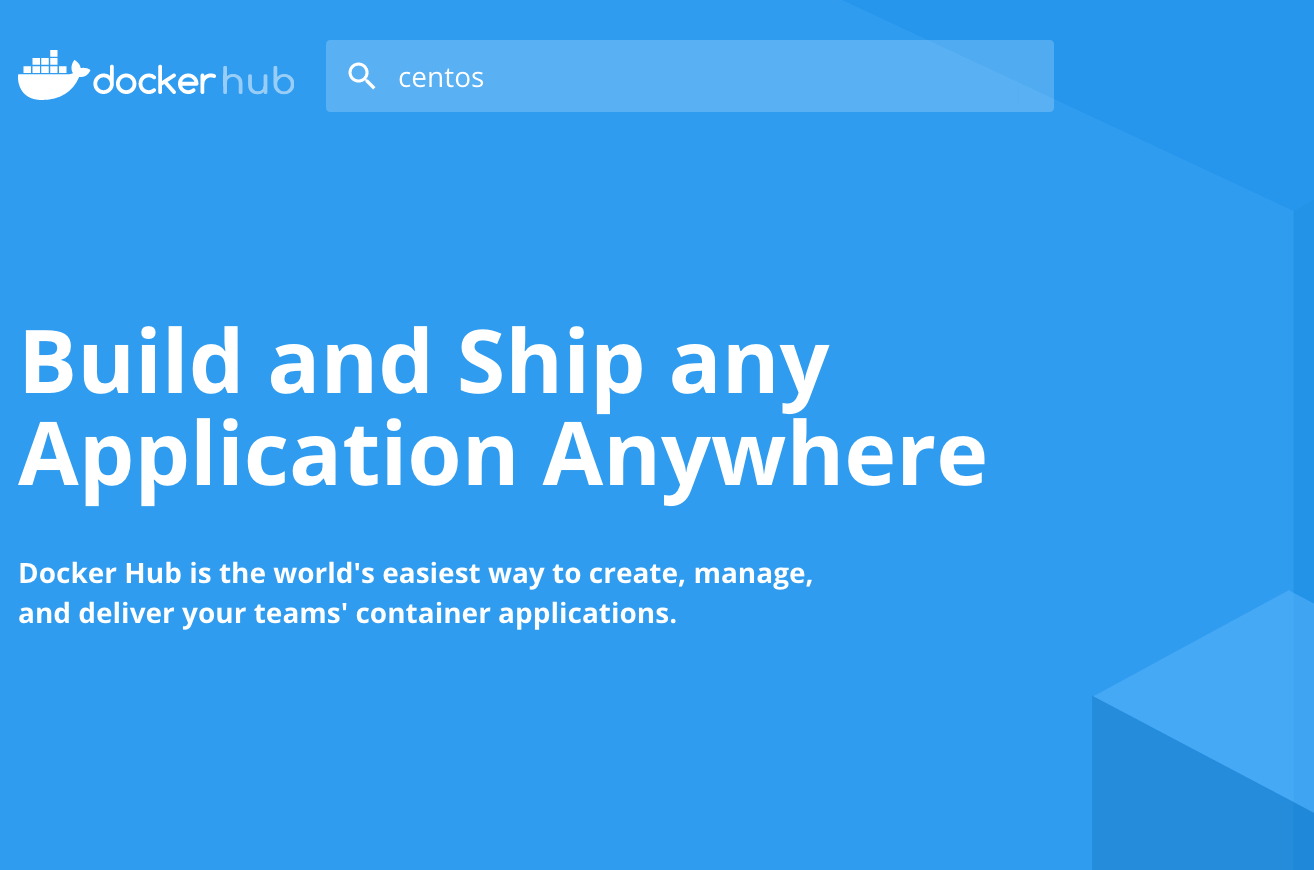 「centos:centos7」というところがイメージの指定のところです。探し方は色々あるのですが、ここに一例をご紹介します。まず、https://hub.docker.com/にアクセスします。そして、画面左上の検索窓に「centos」と入力して、エンターを押して下さい。