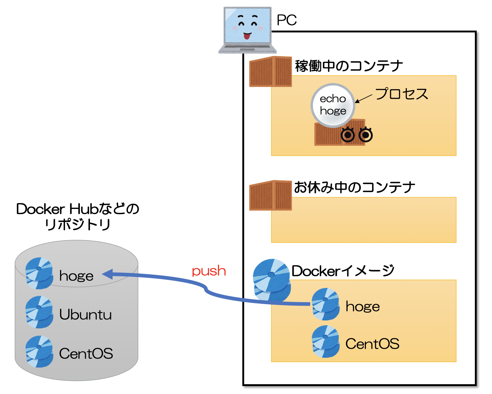 - docker pushコマンド(上図赤字のpushの部分)で、Dockerリポジトリにイメージをアップロードできます。こうすると、イメージを他のPCでも使うことができます。