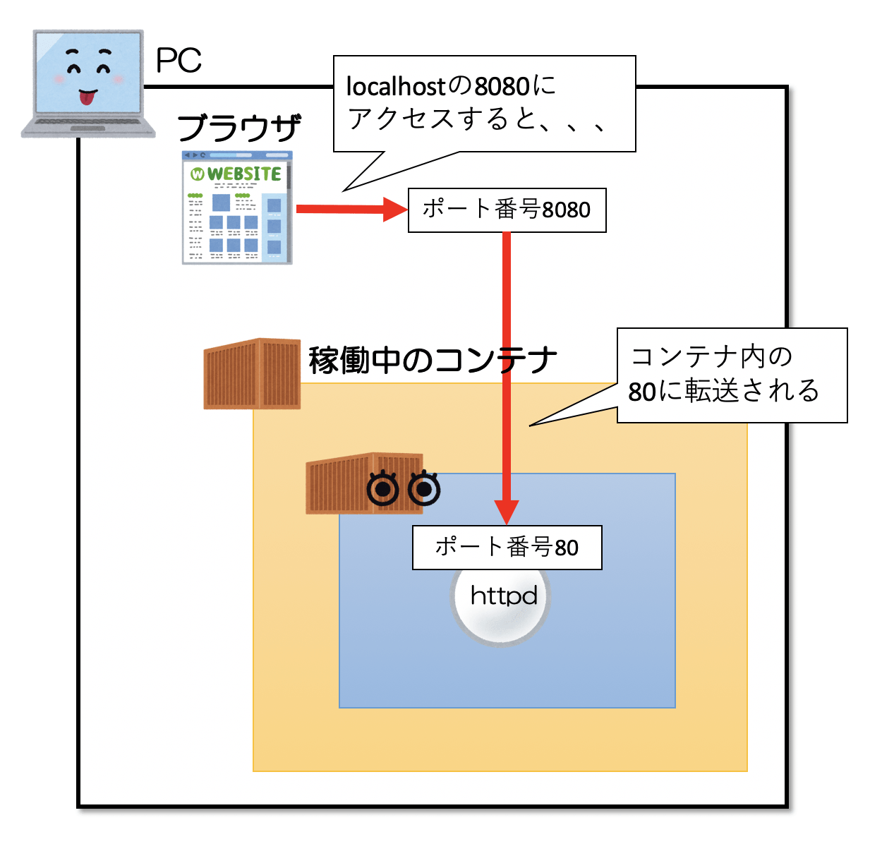 Apacheのイメージをもとに、testwebという名前のコンテナをデーモンで起動し、localhostの8080ポート宛のアクセスを、コンテナの80ポートに転送します。