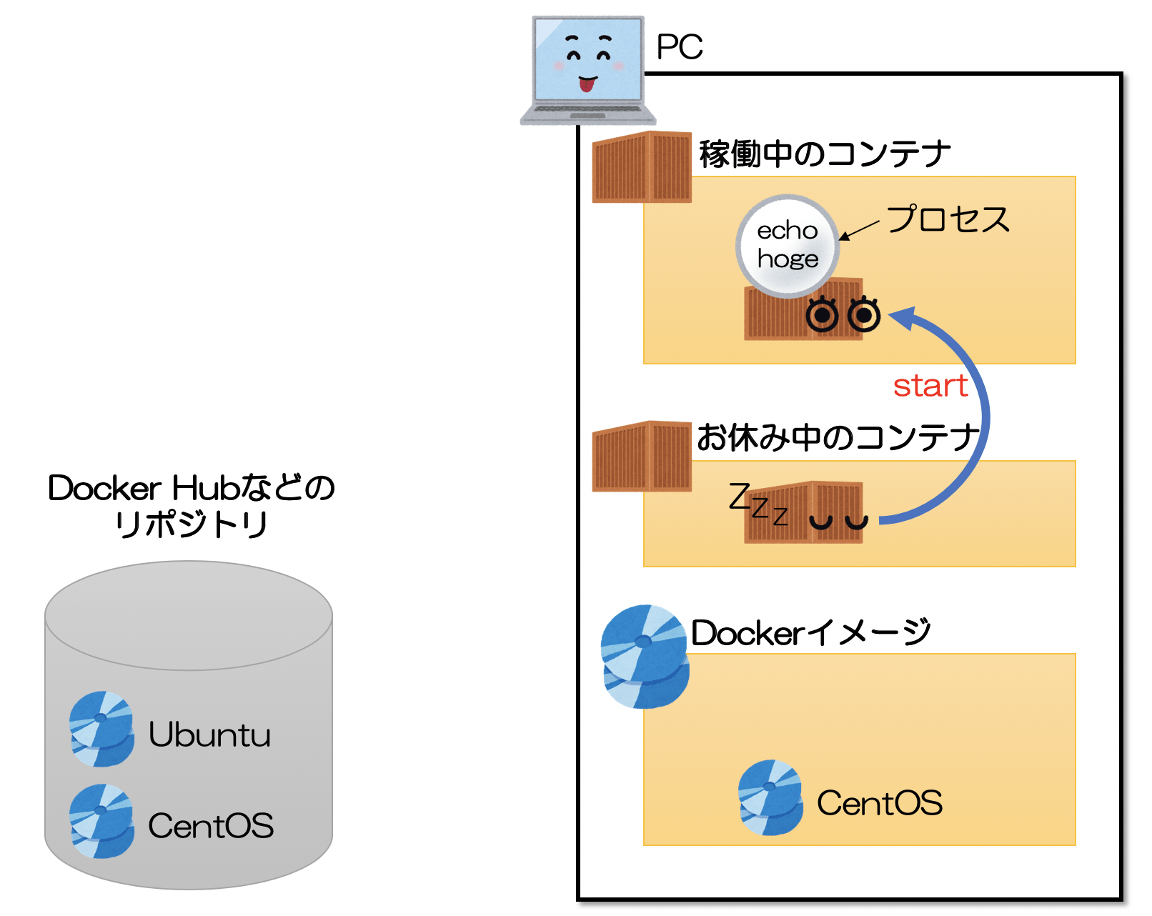 先程停止したDockerコンテナを再開させるためには、docker startコマンドを使います。イメージは以下のような感じです。