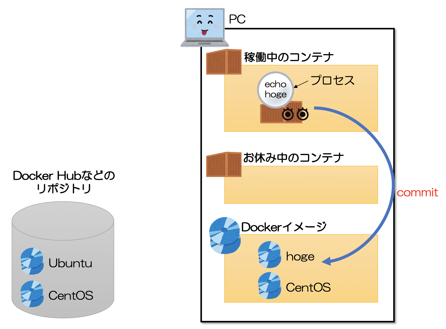 - docker commitコマンド(上図赤字のcommitの部分)で、コンテナをDockerイメージ化できます。コンテナは後述するdocker rmコマンドで消えてしまいます。永続化したい場合はdocker commitコマンドでイメージ化すればOKです。