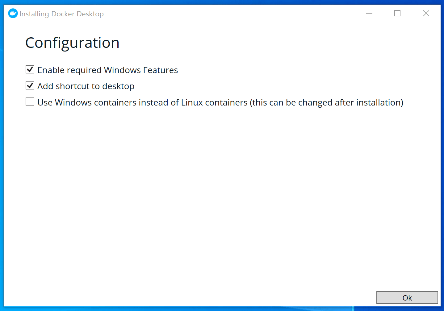 今回はLinuxコンテナを使いたいので、「Use Windows containers instead of Linux conteiners…」のチェックは外して、「Ok」をクリックします。