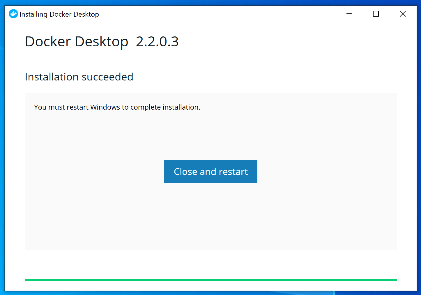 しばらくして、以下のような画面が表示されれば成功です。「Close and restart」をクリックするとOSが再起動されるので、再起動後にDockerが使えるようになります。