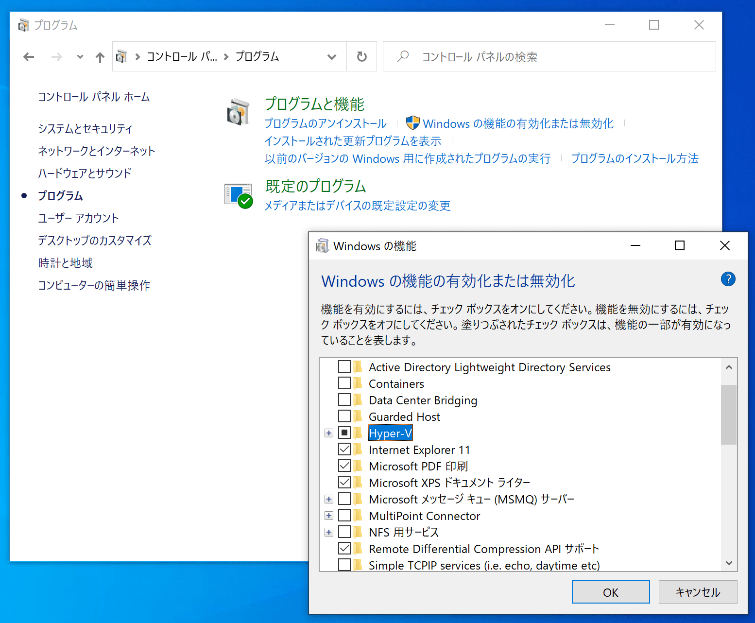 まずはHyper-Vを有効にします。「コントロールパネル」を起動し、「プログラム」→「Windowsの機能の有効化または無効化」の順にクリックして下さい。