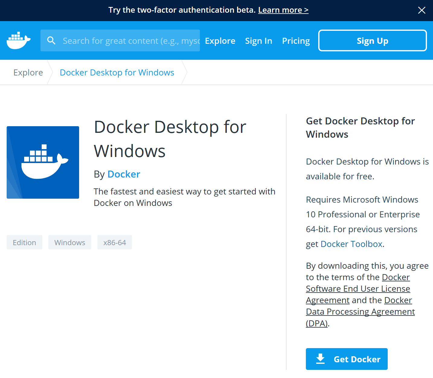 何はともあれまずはDockerのインストールです。WindowsへのDockerのインストール方法についてご説明します。DockerはHyper-Vを必要としますので、WIndows1o Homeでは使うことはできません。Professional以上をご利用下さい。