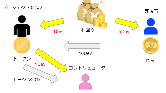5. 分け合う比率はトークンの配分によって決まるためこの図では発起人が4Dev、コントリビューターが1Devの配当を得る。