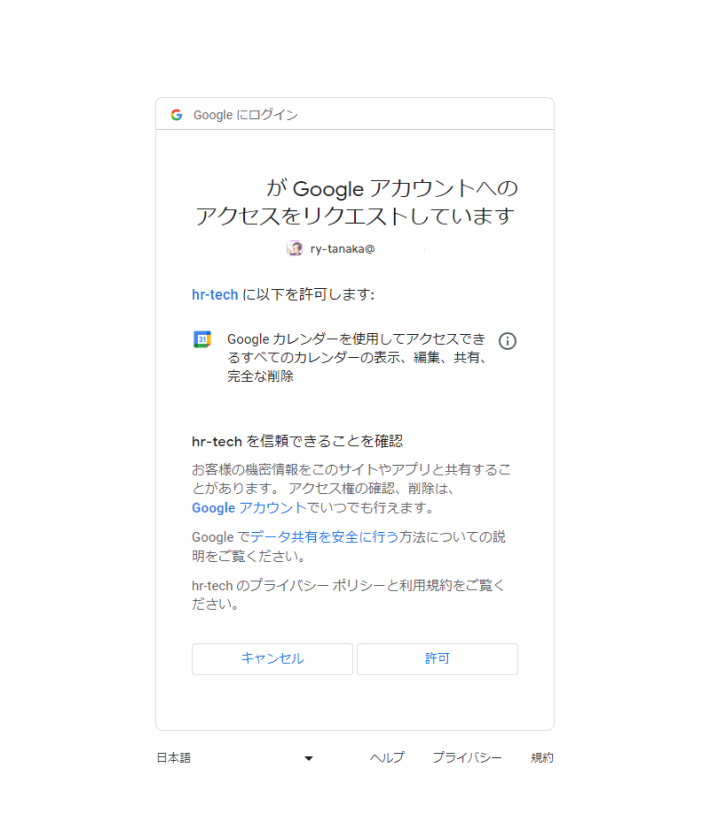 この同意画面をクリックすることでカレンダーの予定が編集されたりします。これの裏側で起きている一つのアクションとしてOAuth認証があるのです。